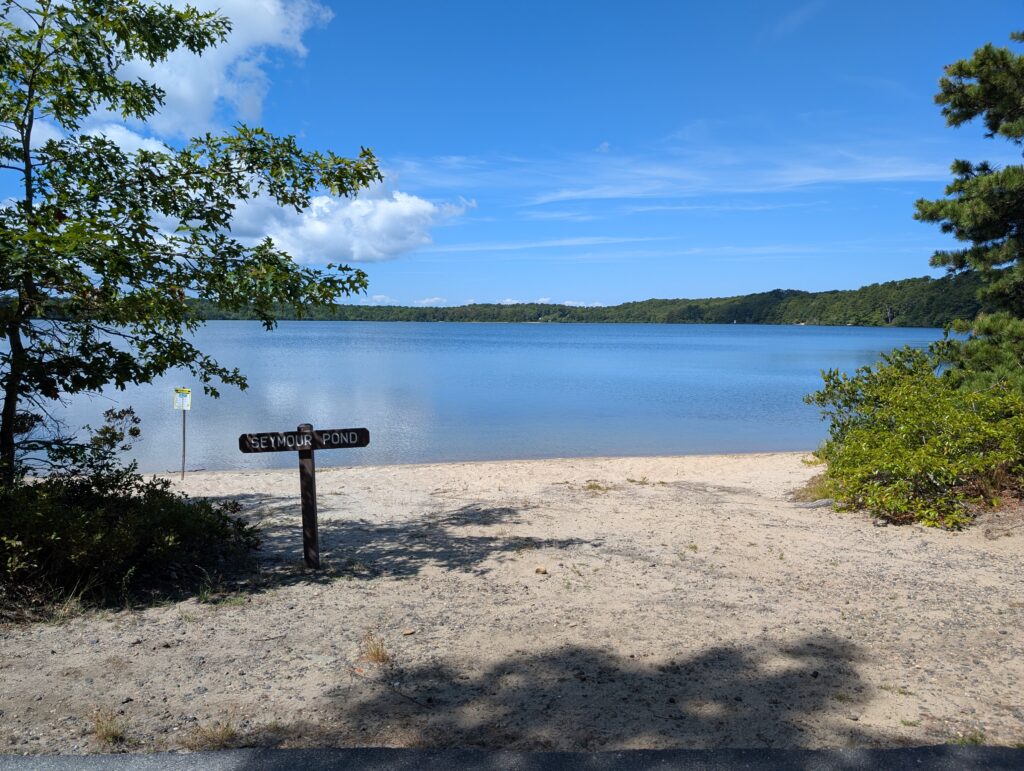 History: Seymour Pond is natural kettle pond as well as a Massachusetts Great Pond. Transparency is between 6 and 13 feet. The bottom is composed of sand and rubble, and aquatic vegetation is scarce. The pond’s two-mile shoreline is lightly wooded. Development is limited to a few houses, cranberry bogs and a town beach. The pond is fed by groundwater, drains to Hinckleys Pond and is part of the Herring River Headwaters.